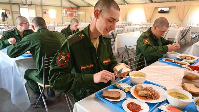 Военнослужащие самостоятельно выбирают блюда из предложенного ассортимента. Посещение столовой осуществляется двумя потоками по талонам, получаемым у дежурного по роте