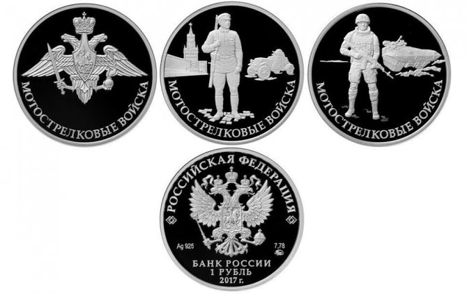 - 1 декабря 2021 года Банк России выпустил три серебряные монеты «Мотострелковые войска» номиналом 1 рубль. На них изображена эмблема Сухопутных войск ВС РФ; солдат Красной армии на фоне Спасской башни и бронемашина БА-27; военнослужащий мотострелковой бригады и БМП Т-15.