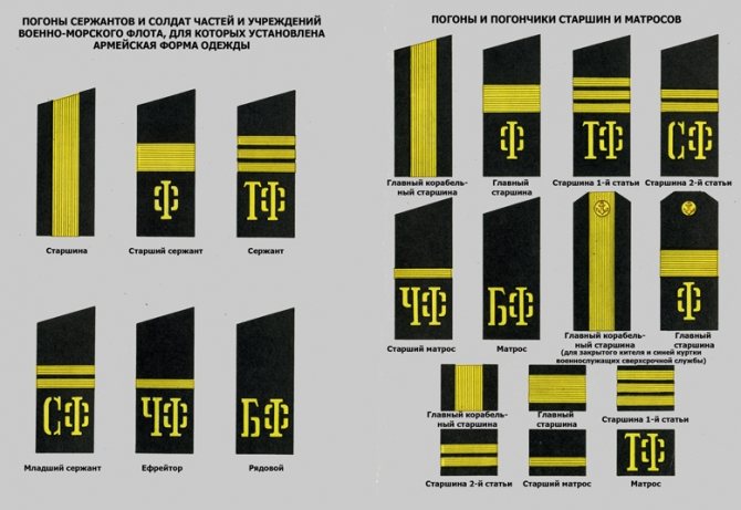 Старший матрос может командовать группой армейцев или временно замещать командира части. На погонах обозначена буква «Ф».