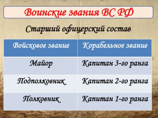 - Ранг высшего состава офицера присваивается после года службы на корабле в прежнем чине.