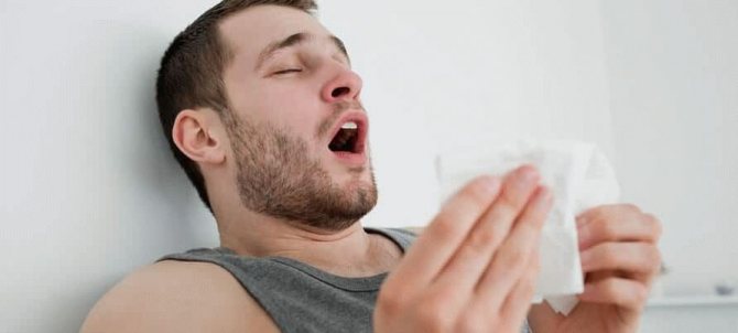 Если рассматривать состояние носоглотки, то здесь ощущается сильный зуд, неправильное нарушенное дыхание, регулярные приступы чихания, обильные выделения из носа.
