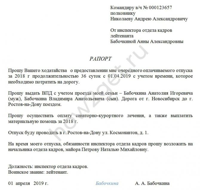 Основания для отдыха и причины необходимости его получения военный излагает в рапорте. Его нужно оформлять для: