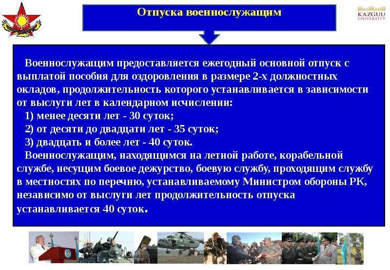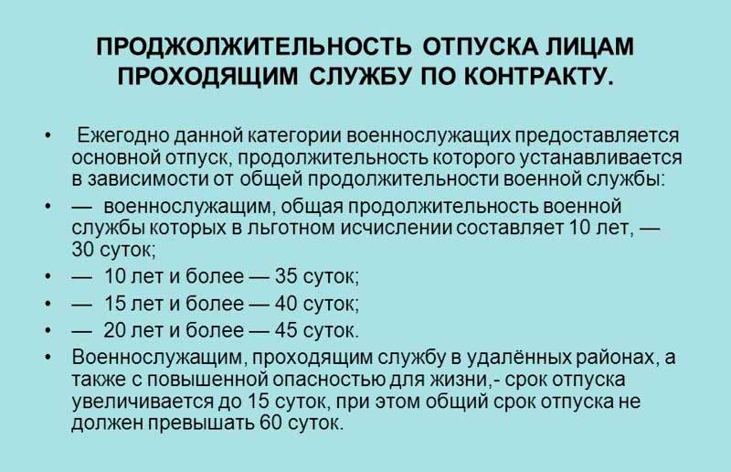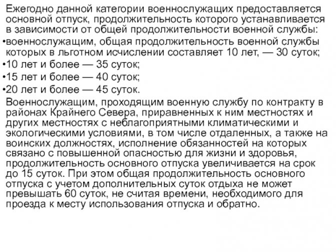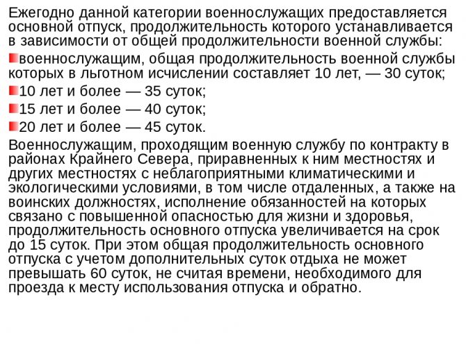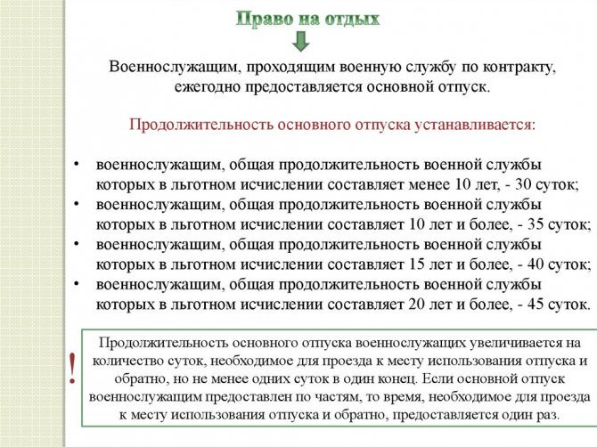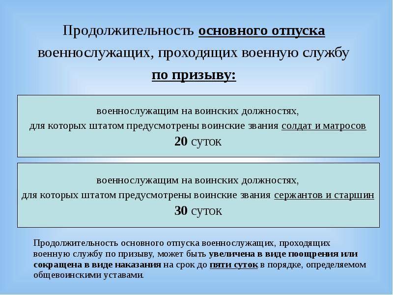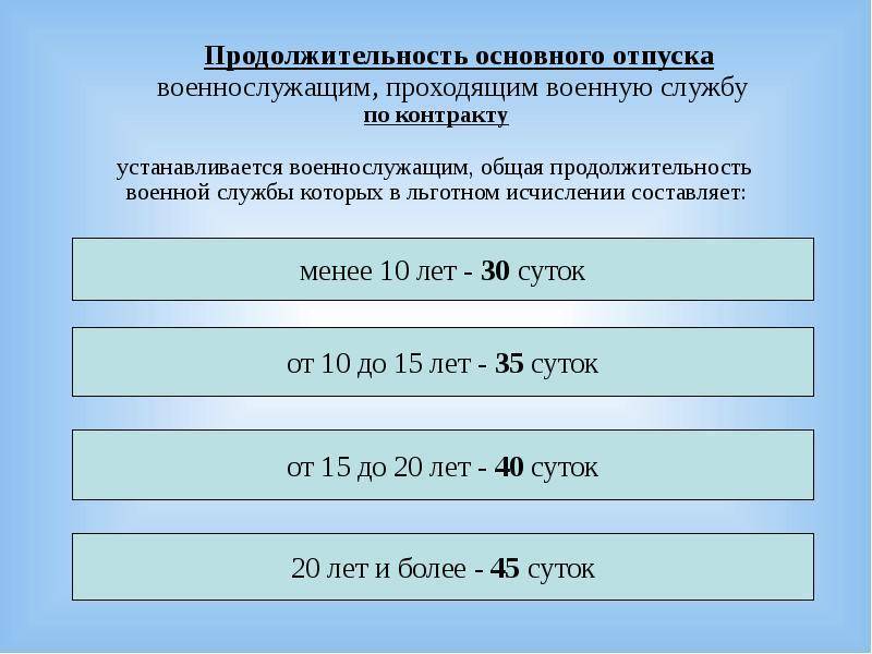 - Основной — периоды, предоставляемые военным ежегодно. Продолжительность зависит от срока несения службы.