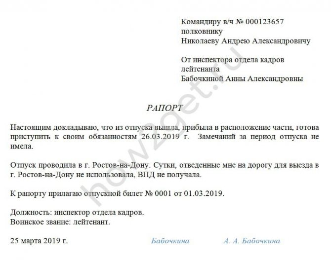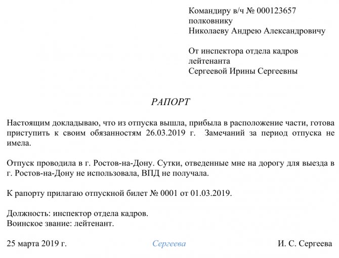 Рапорт о прибытии с отпуска составляется как отчет о возвращении в часть и готовности приступить к своим обязанностям. В документе указывается место отдыха, обстоятельства, связанные с его оформлением — количество полученных дней, предоставление дополнительного времени на дорогу, иные обстоятельства.