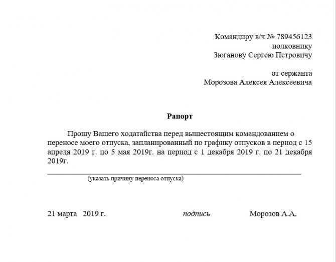 - Ф.И.О., должность и наименование военной части начальника, на чье имя оформляется рапорт (указываем сведения о непосредственном начальнике).