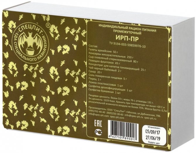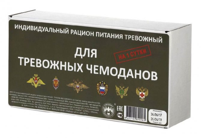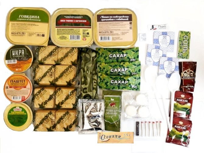 Количество продуктов в сухом пайке зависит от продолжительности запланированных учений в полевых условиях. Сухие пайки комплектуются с расчетом на одноразовый прием пищи или сразу на сутки.