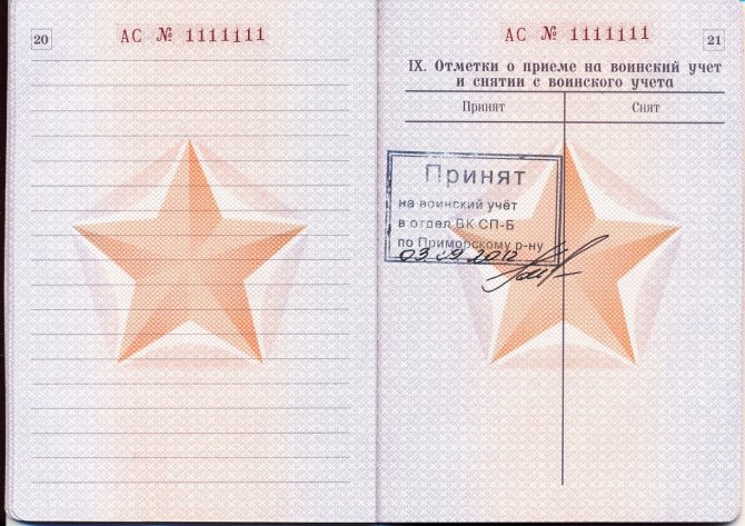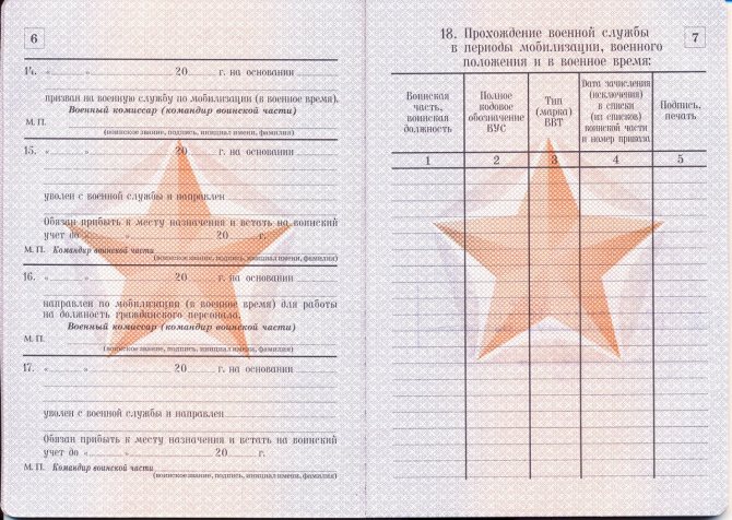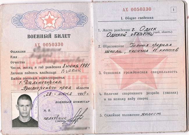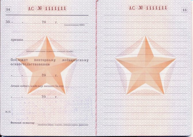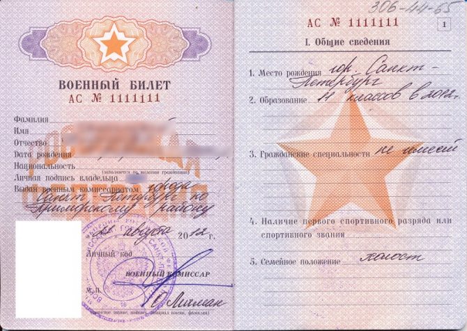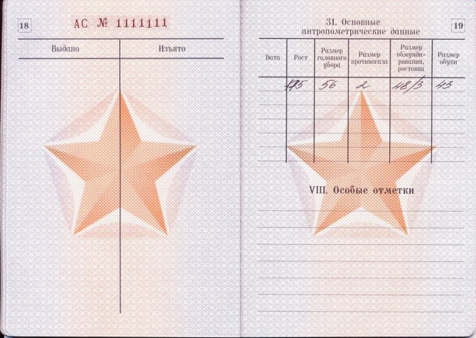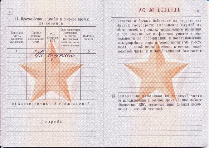 Образец документа, который приведен в этой статье, служит только для ознакомления с содержанием страниц военного билета. Указанный пример образца не является документом воинского учета.